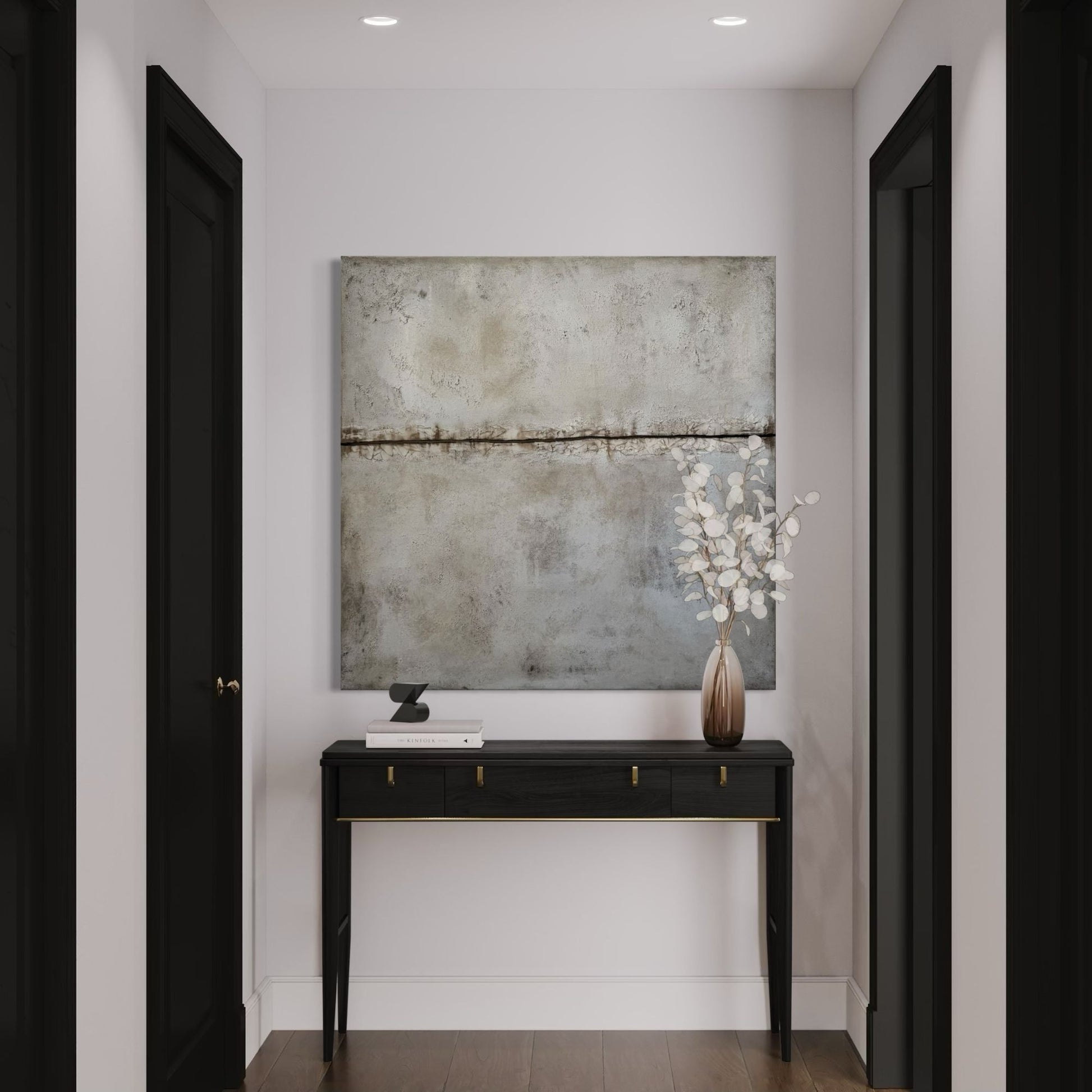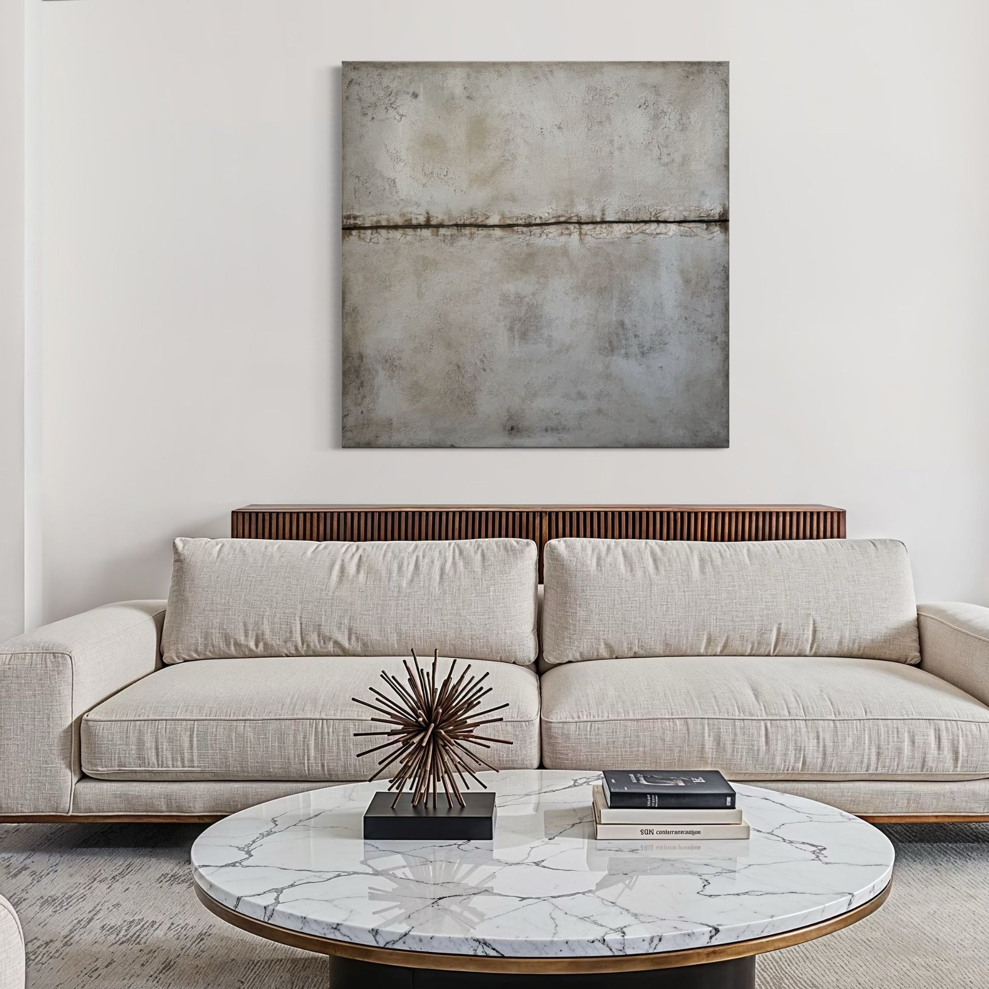 La línea que atraviesa la composición sugiere un límite sutil entre tierra y aire, creando una sensación de profundidad y equilibrio. Sus tonos neutros y minerales aportan calma y una presencia silenciosa que se integra de forma natural en interiores contemporáneos, orgánicos o minimalistas. Realizada a mano sobre bastidor, la pieza combina textura, matices y una estética atemporal que acompaña con armonía muebles en madera, fibras naturales y paletas suaves. Una obra que invita a la contemplación desde la sencillez.
