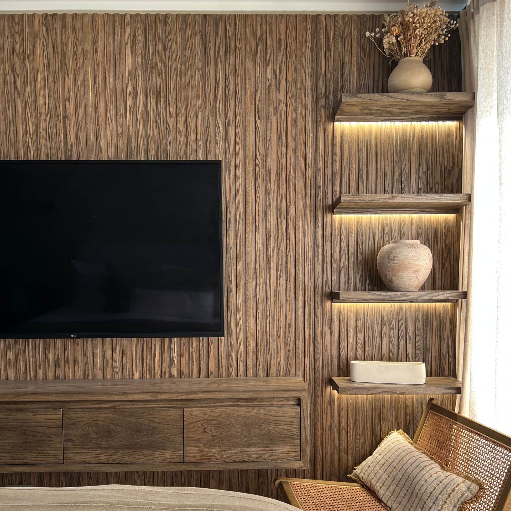 Un diseño compacto que aprovecha al máximo el espacio, pensado para ordenar y realzar el dormitorio. Integra zona de exhibición, espacio para TV, mueble de guardado y espejo de gran formato, todo con iluminación LED incorporada y una trasera en palillaje que aporta textura y calidez.