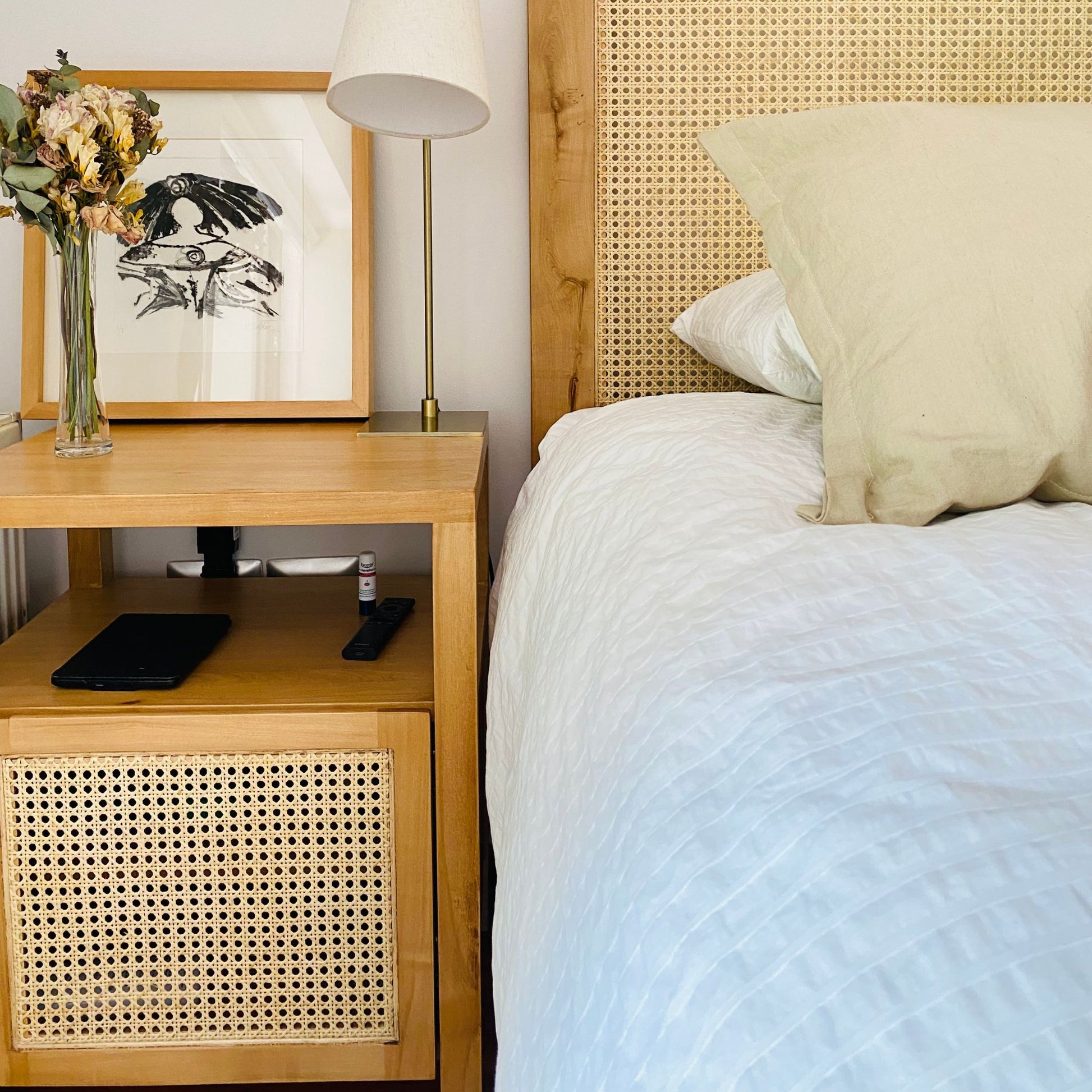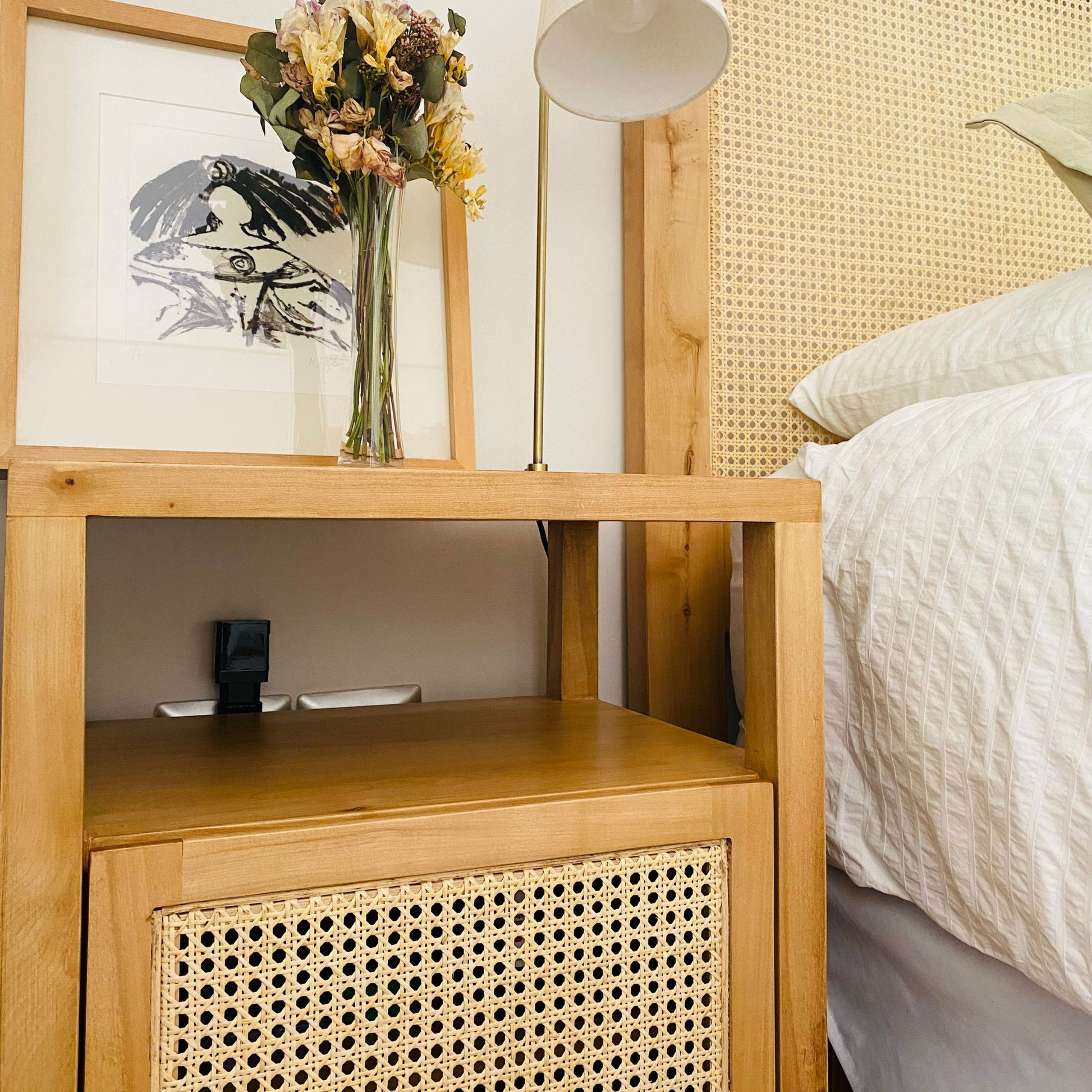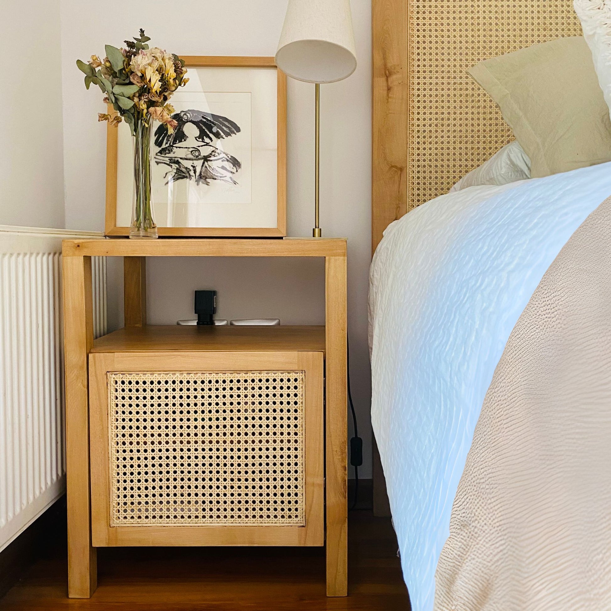 Un diseño liviano que deja espacios visuales, el velador es una muy linda opción. La combinación del junco y madera logra un espacio acogedor.