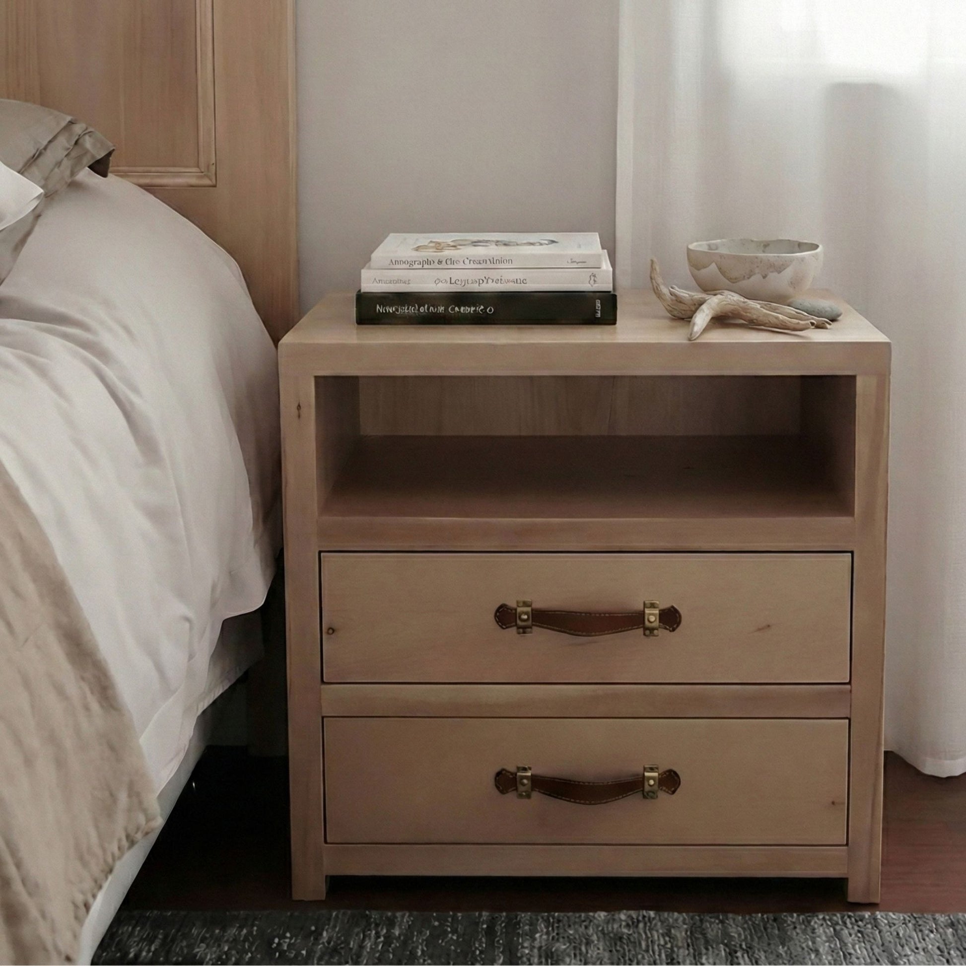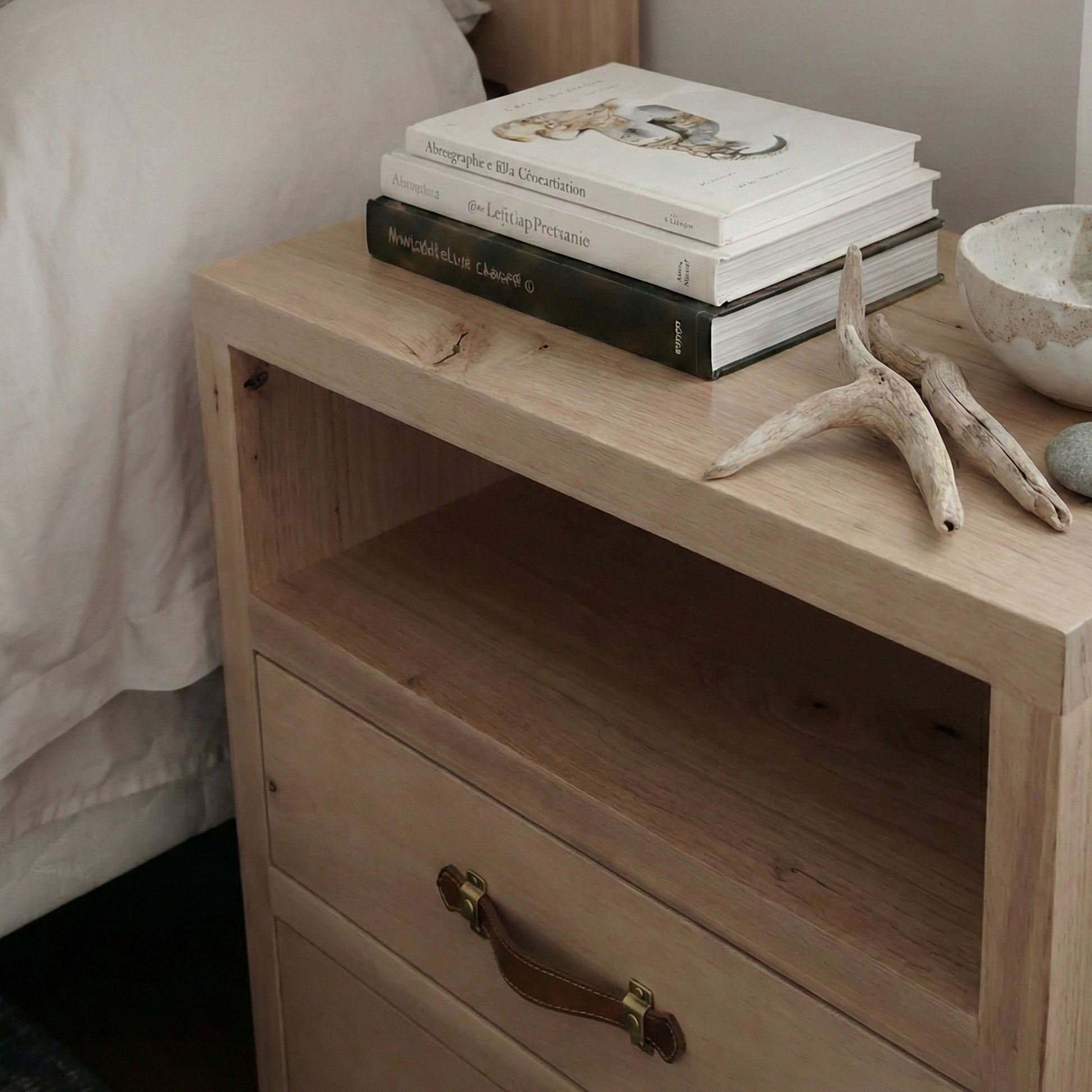 Su diseño combina dos cajones con tiradores de cuero natural y un espacio abierto, ideal para libros o elementos de uso diario.